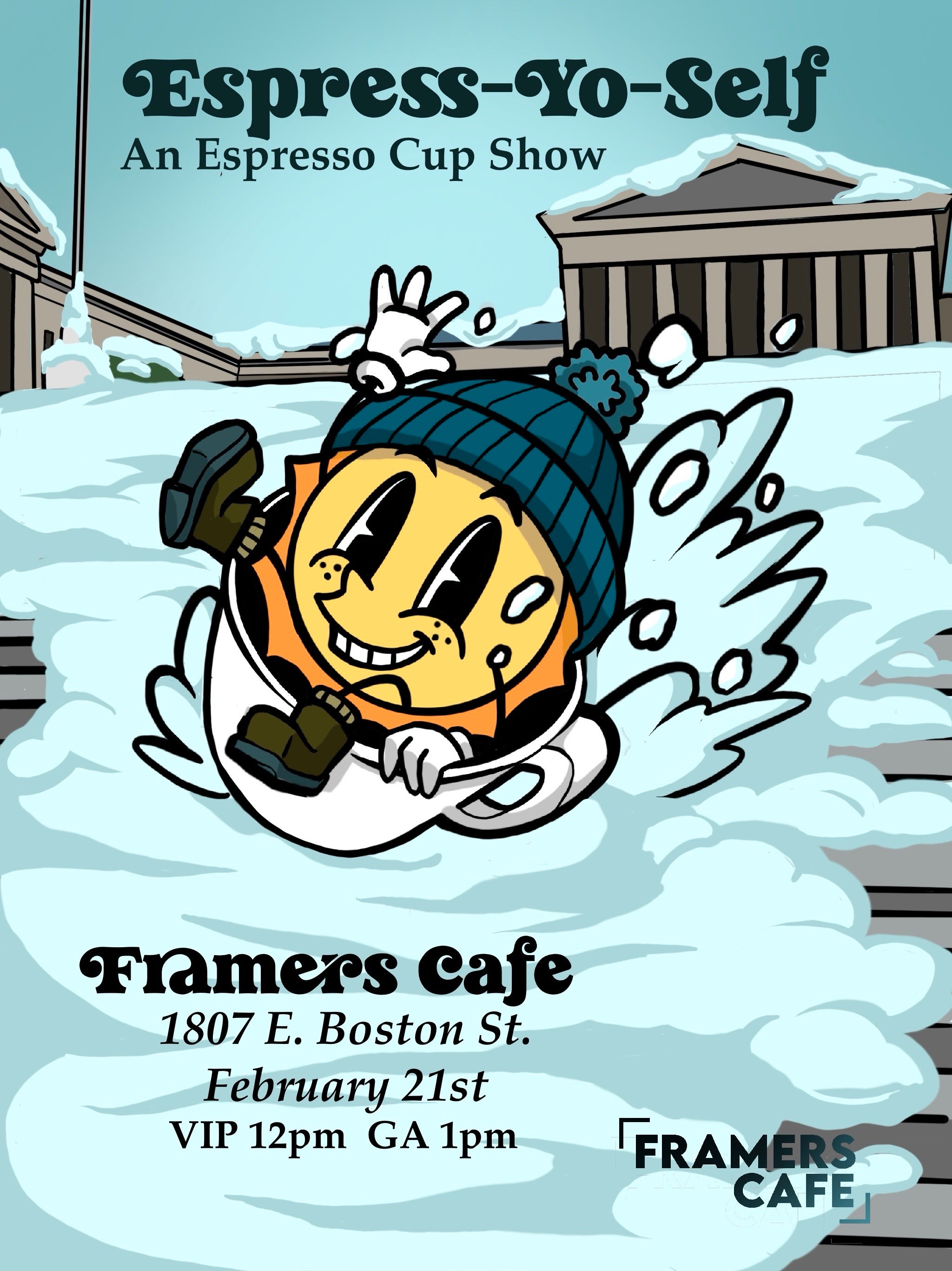 This will be the 2th annual Espresso Cup Exhibit taking place on February 21st at Framers Cafe/Justanothergallery with a rain date of February 22nd. This curated show will feature over 25 artist from around the US with the most unique Espresso ever available.