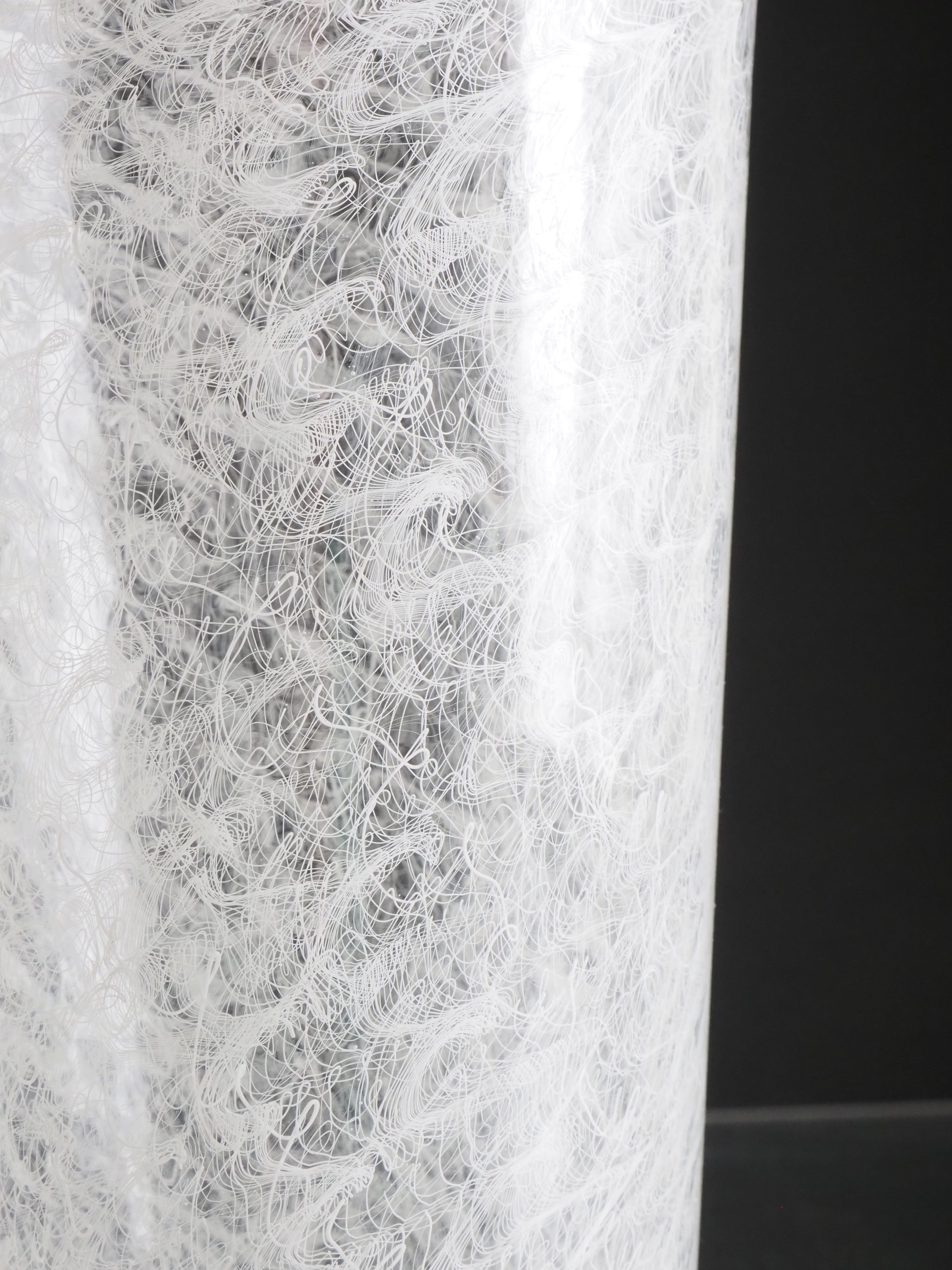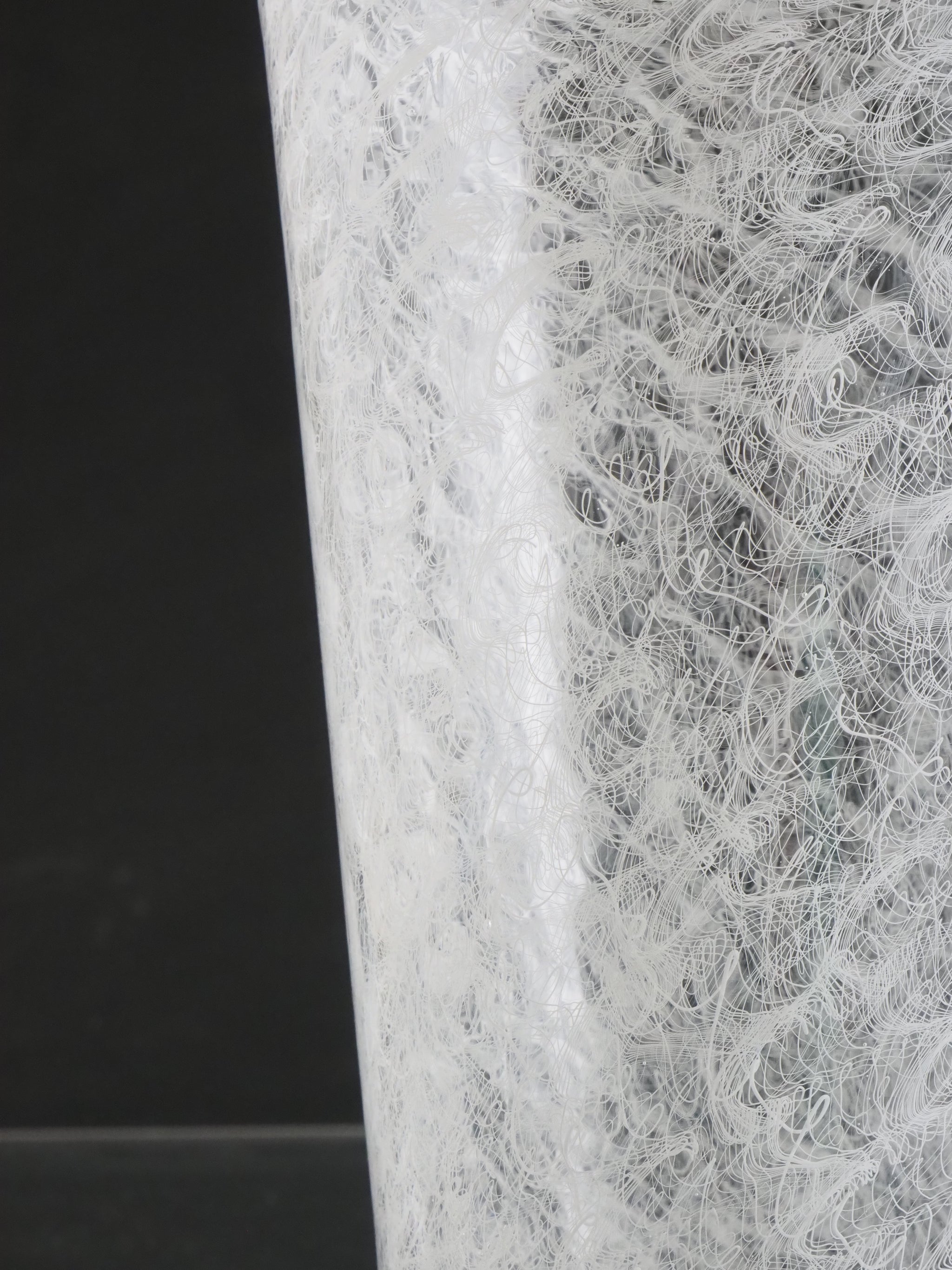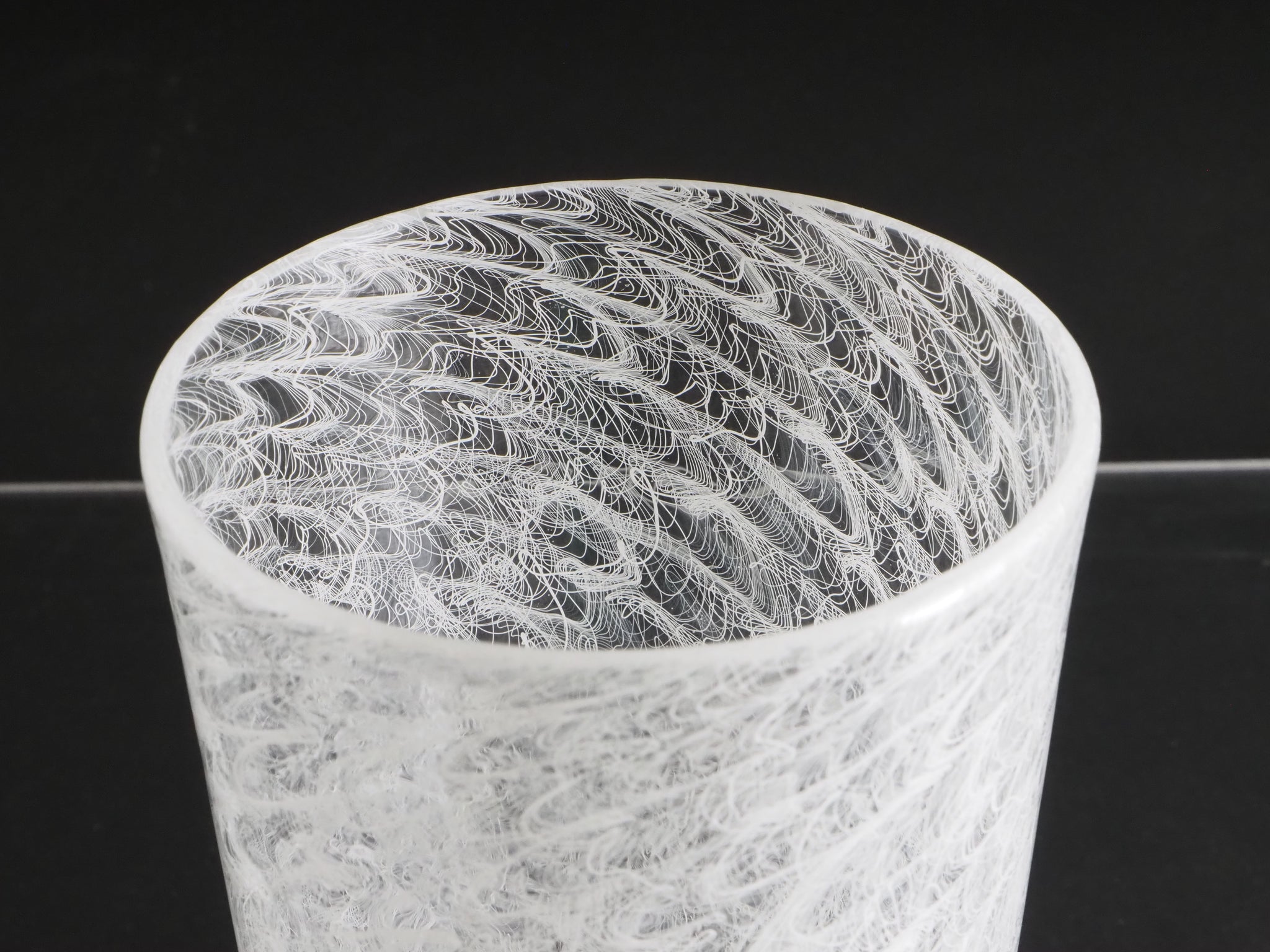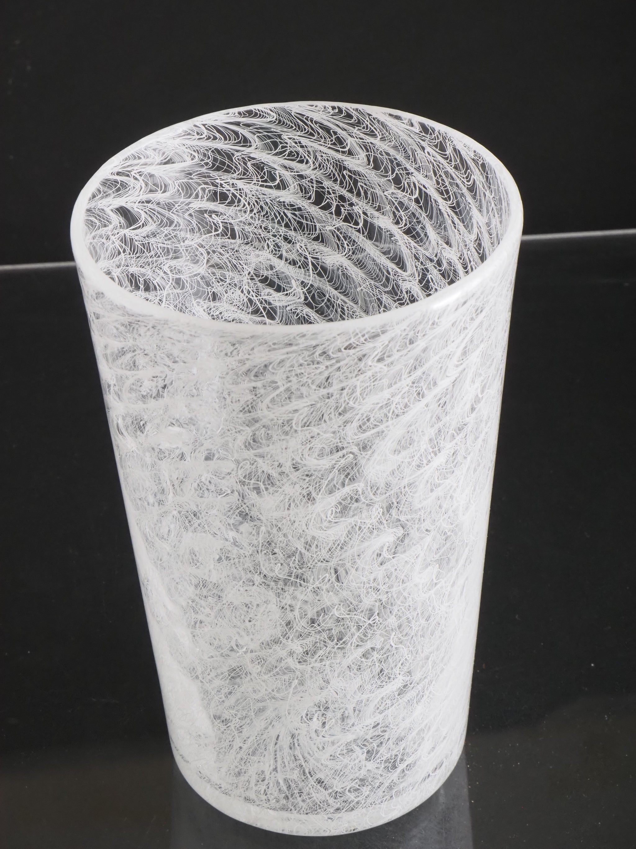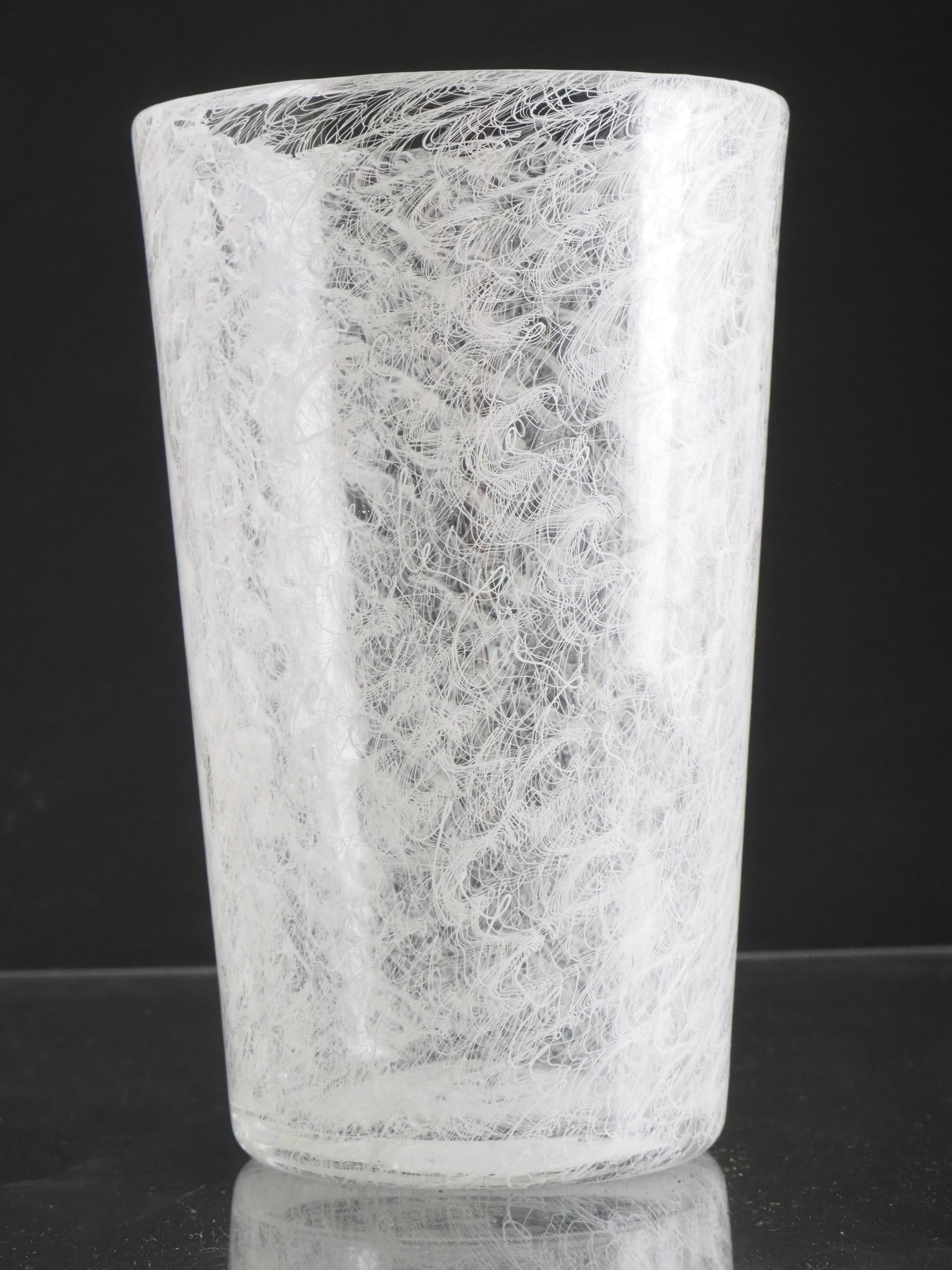 The Merletto technique in Italian glassmaking, particularly associated with Murano glass, involves embedding delicate lace-like patterns within the glass. This is typically achieved by arranging fine threads of white or colored glass in intricate geometric designs, often using a clear glass matrix to encase and preserve the pattern. The result is a refined, lace-like effect that showcases exceptional craftsmanship and visual elegance.
